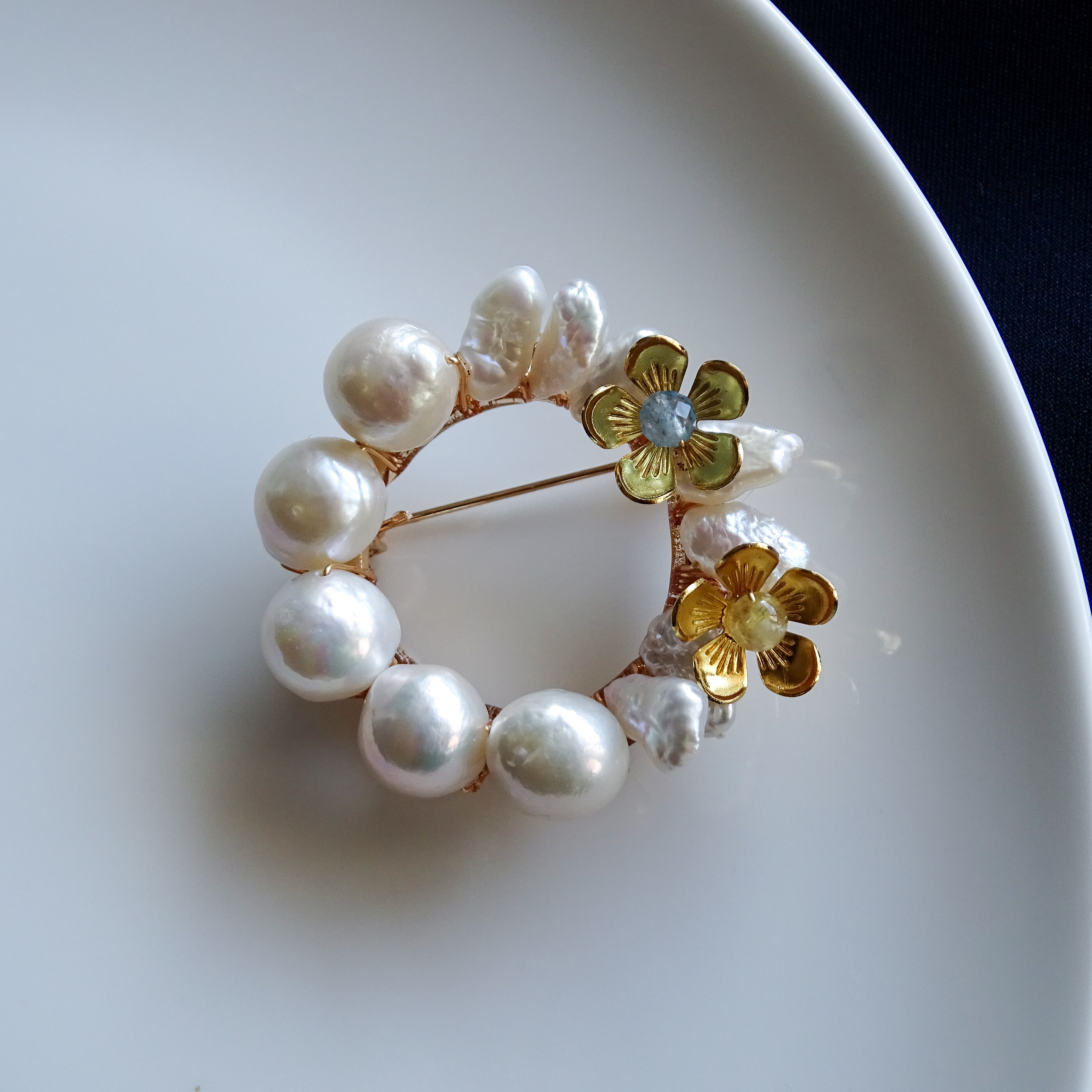 バロック淡水パールとケシパールを円に連ね、