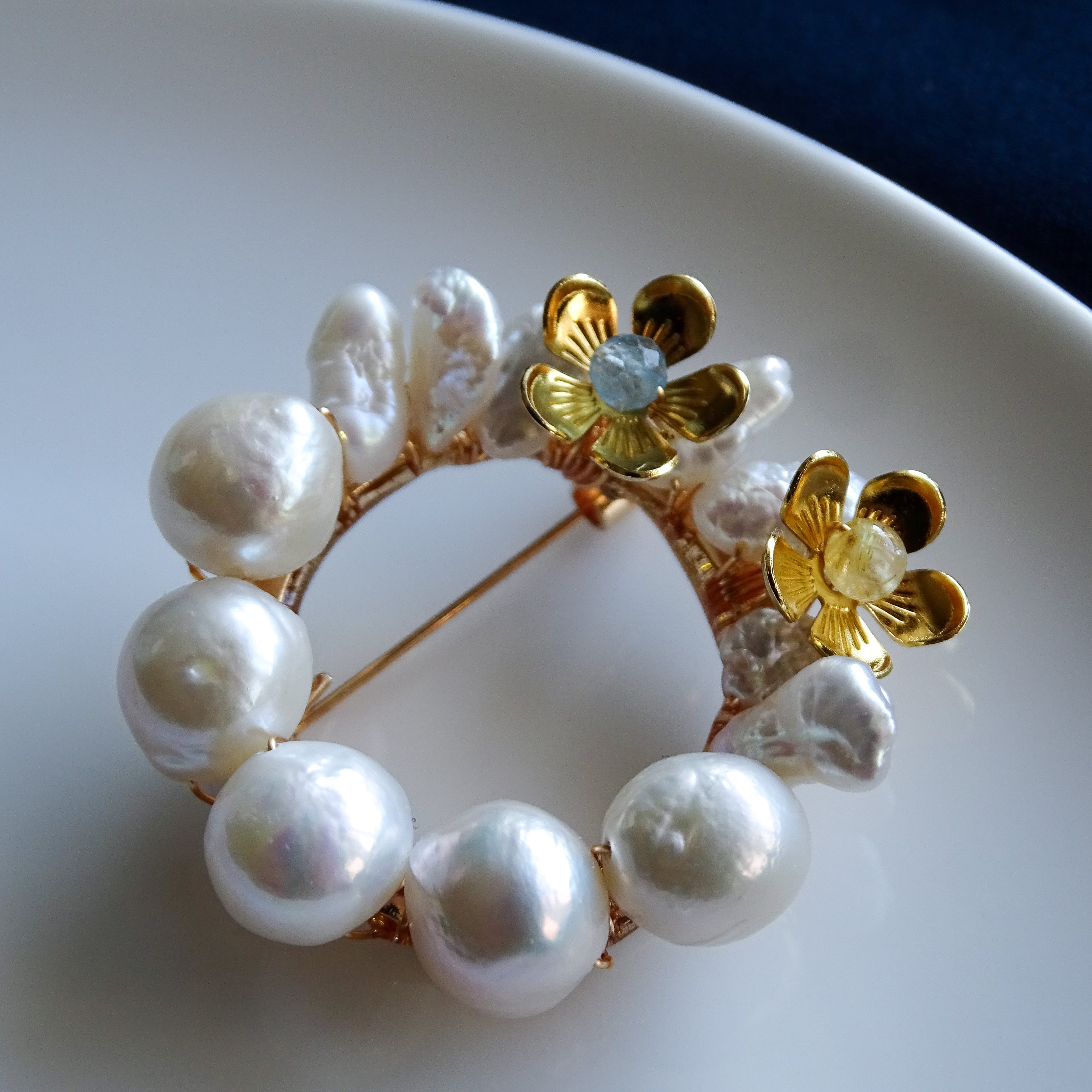 お花の中心にはアクアマリンとゴールドルチルの天然石をのせました。