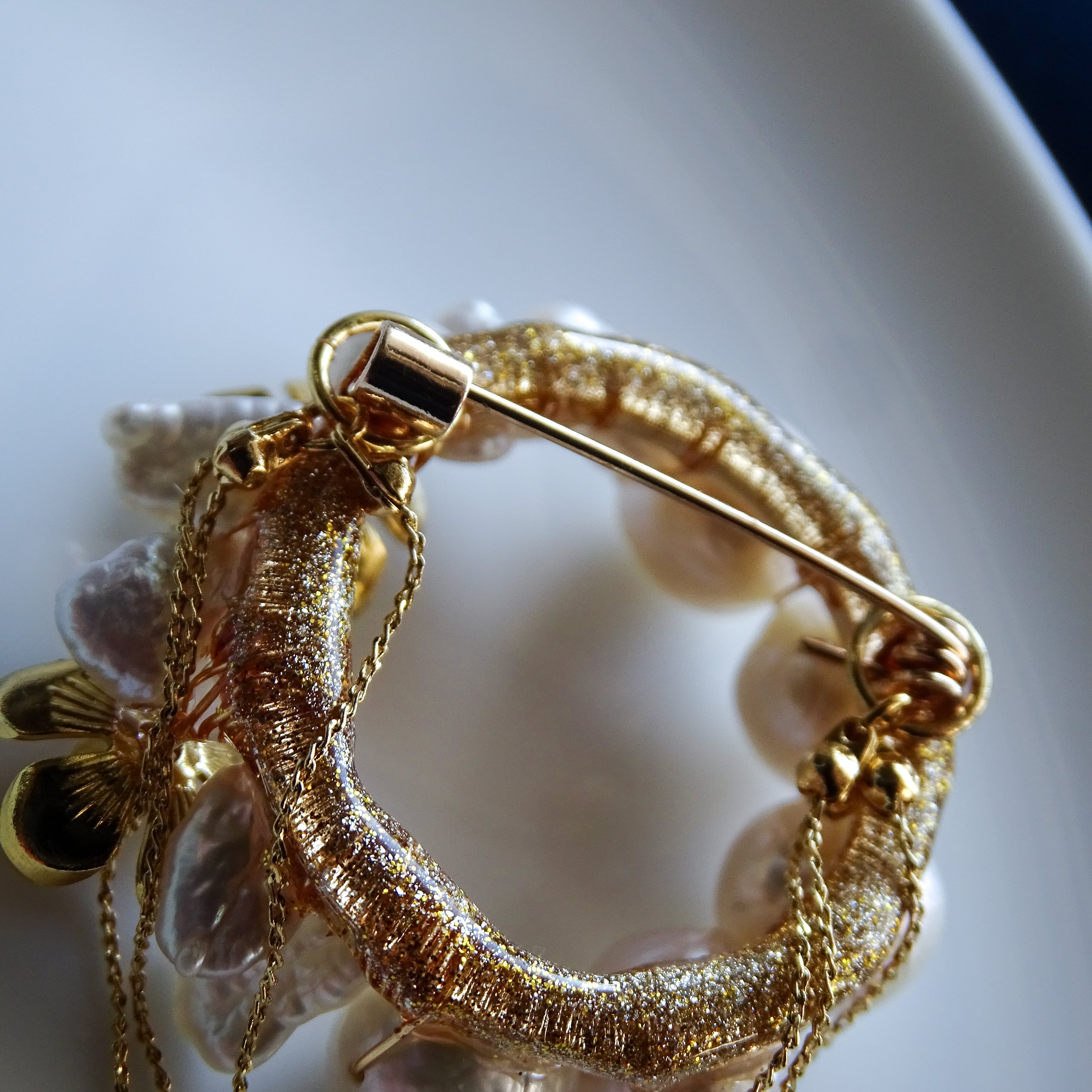 ブローチの裏面はお洋服との引っ掛かりを減らすため、樹脂コーティングで仕上げております。