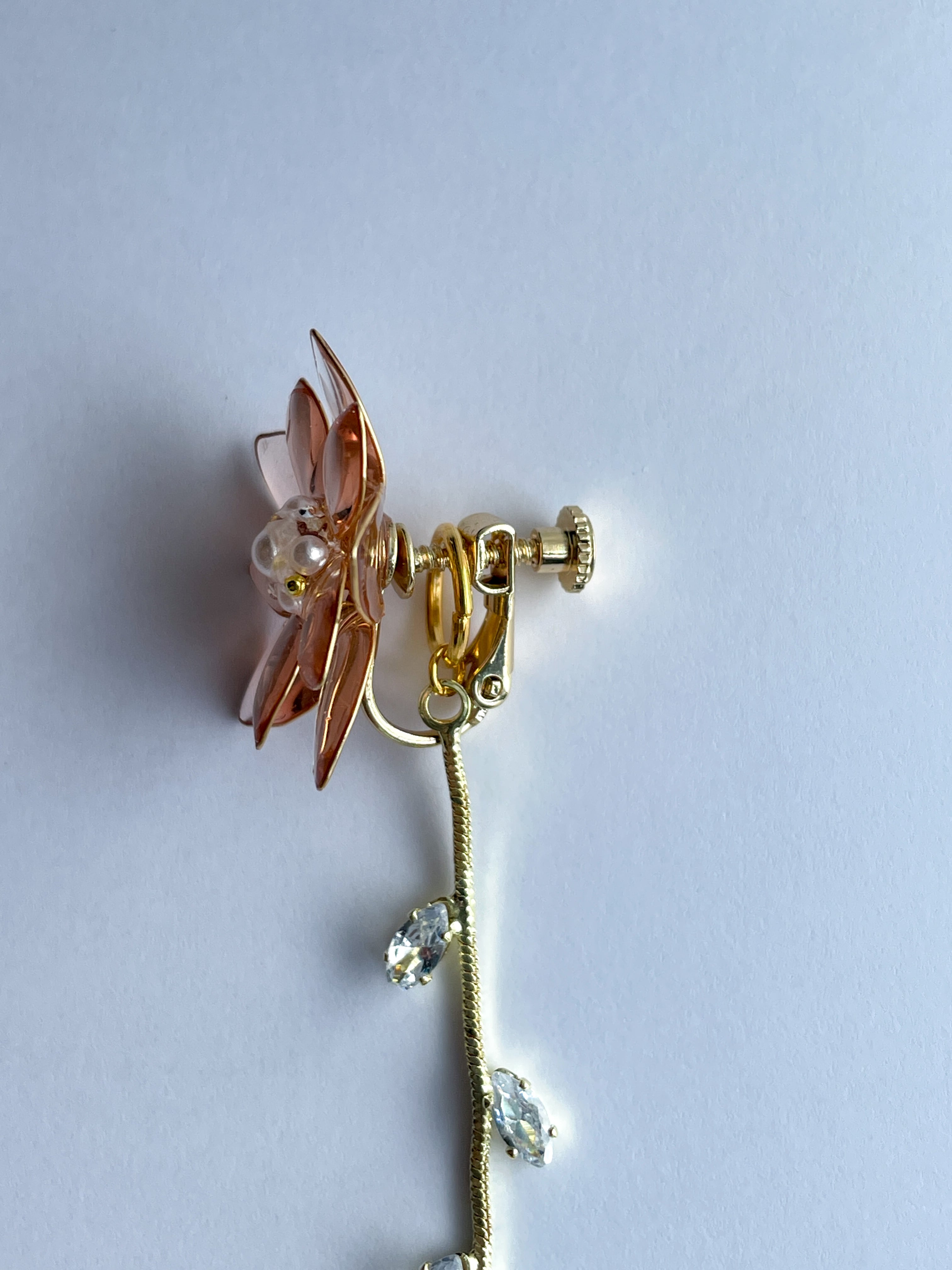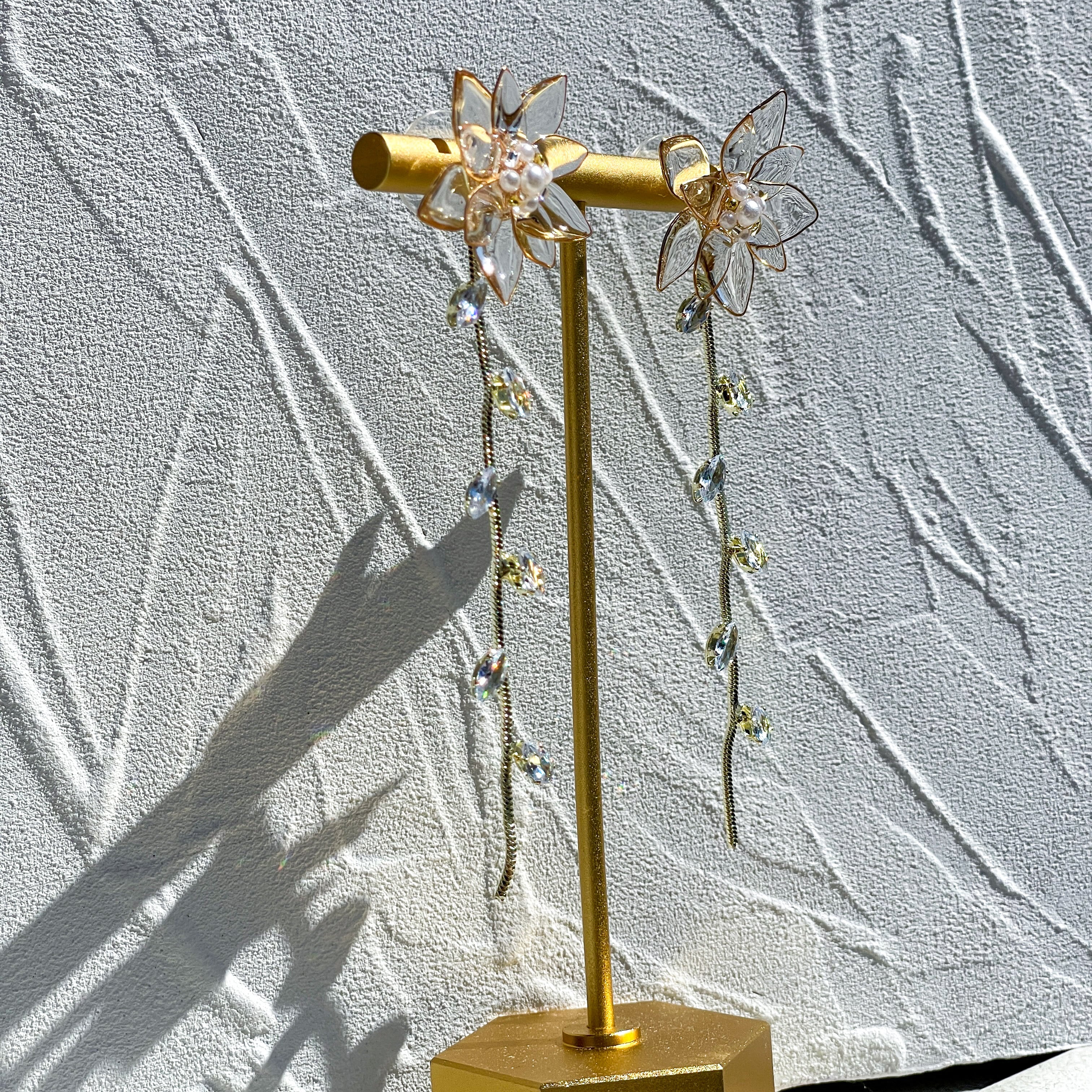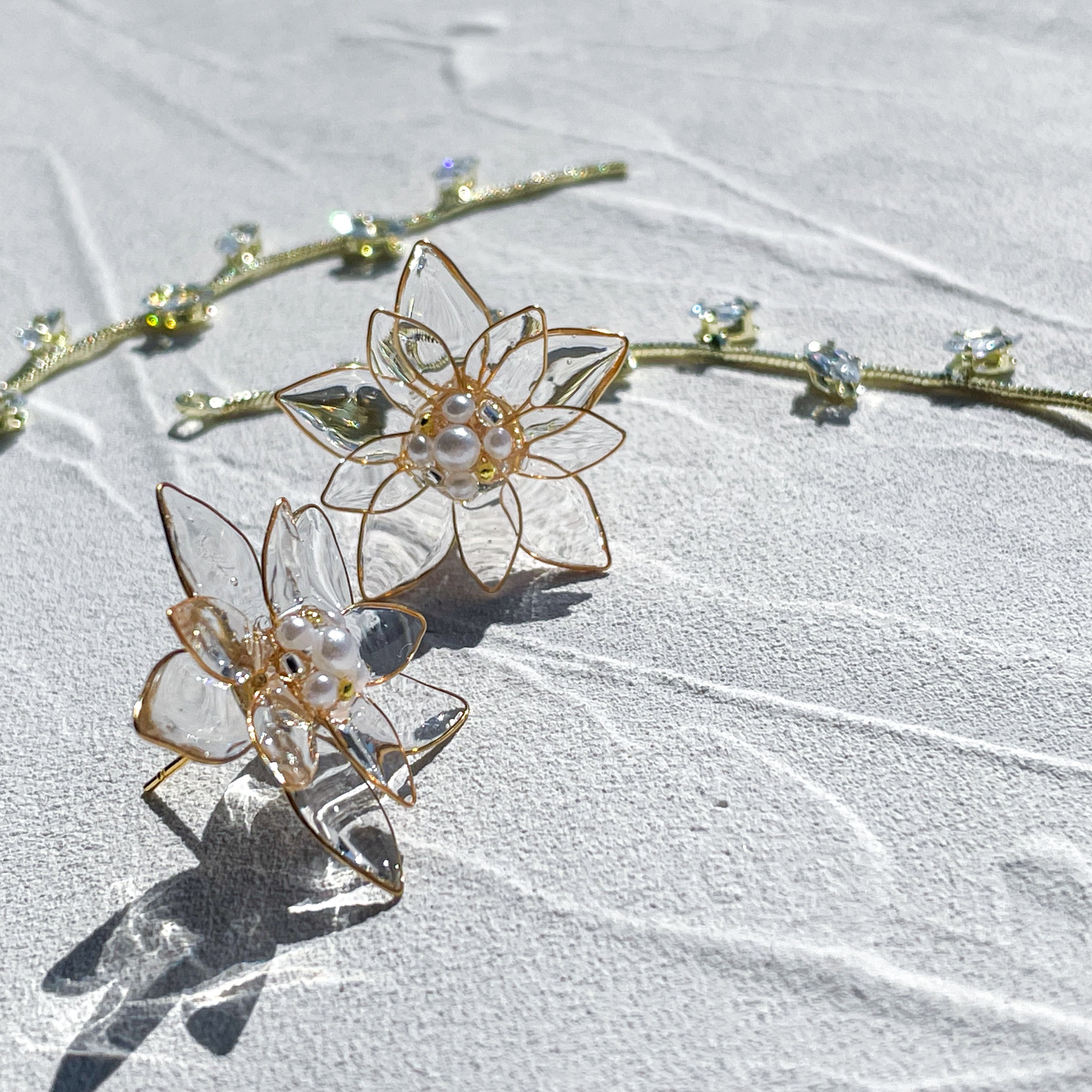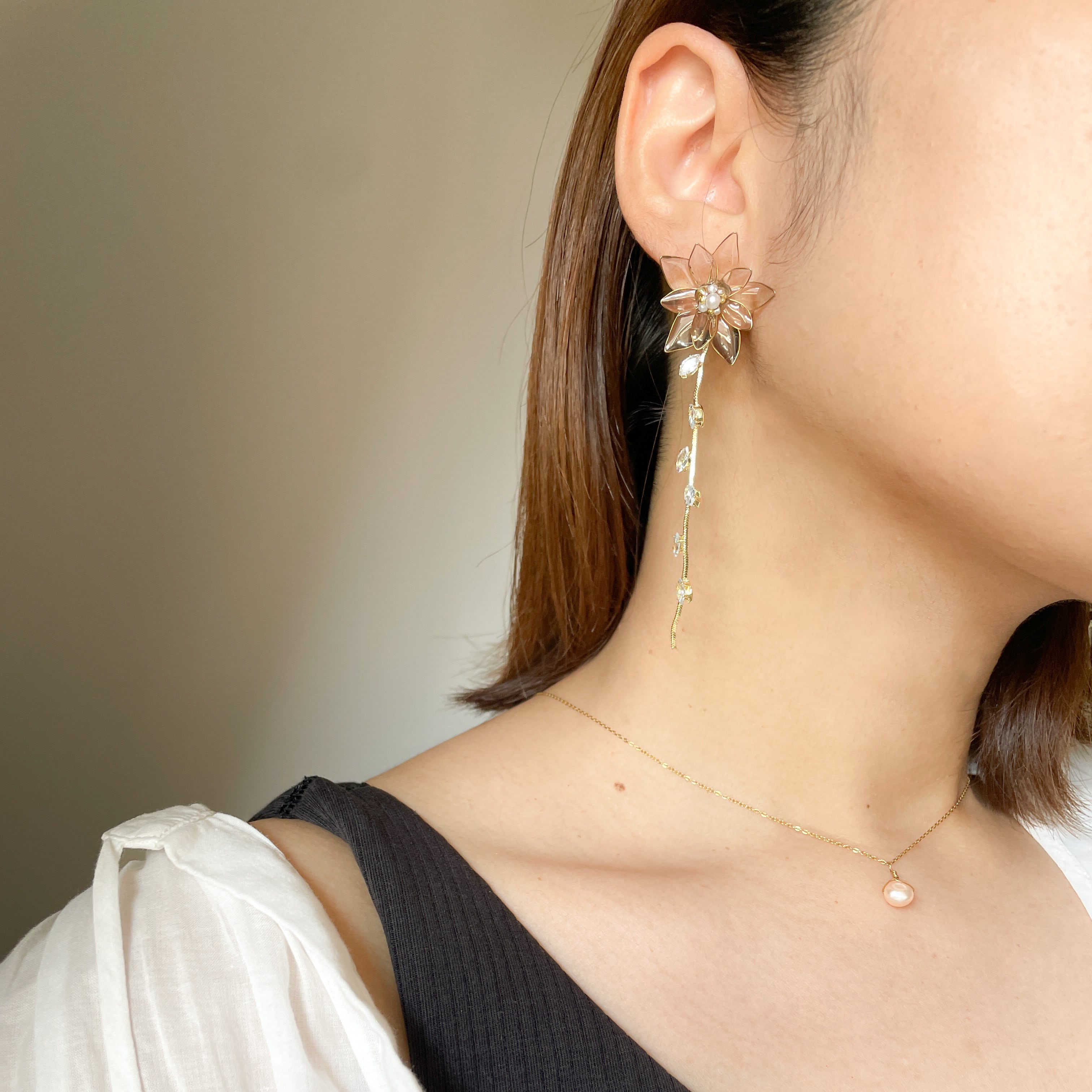 透き通る透明のお花とゆらゆら揺れる葉っぱが耳元を華やかに彩ります。
