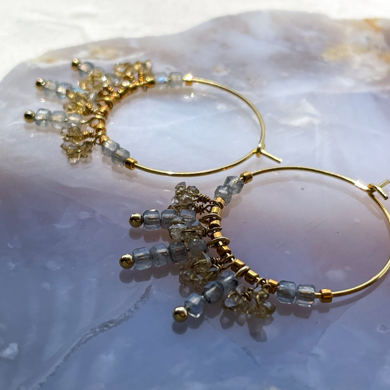 天然石ラブラドライトとダブルポイントクリスタルのフープピアス│天然石 金属アレルギー SUS316L